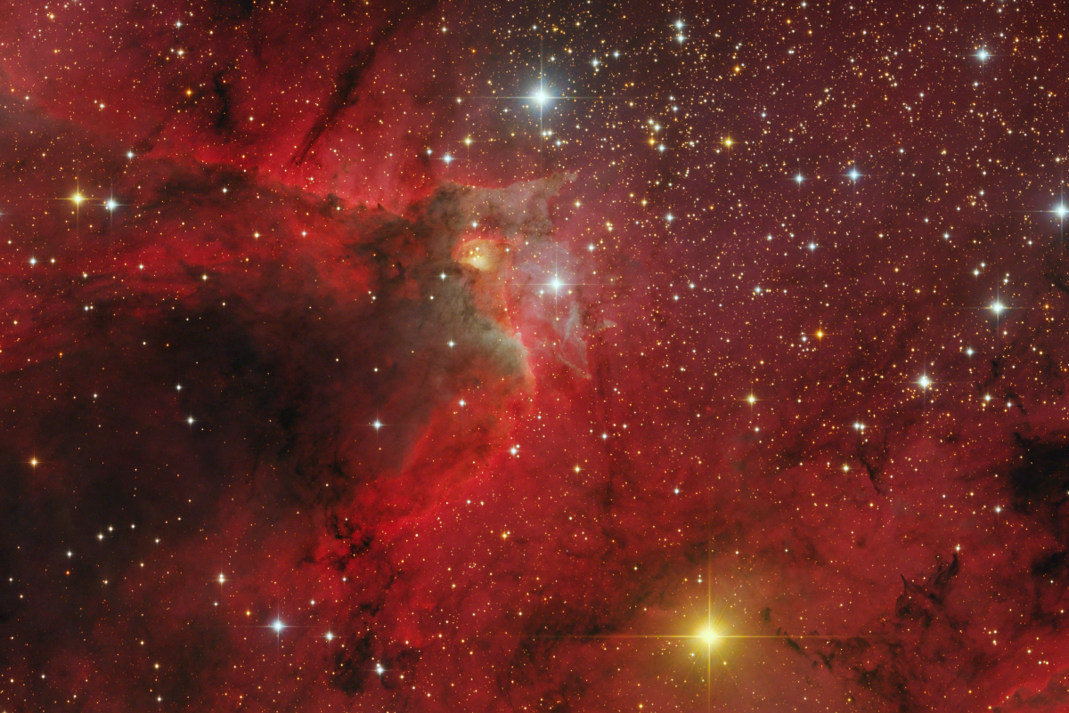 Sh2-155 oder LBN 529 ist eine Sternentstehungsregion im Sternbild Cepheus. Die große Ambossförmige Dunkelwolke ist Dobashi 3420. An der Spitze dieser Dunkelwolke sieht man gelbe und bläulich leuchtende Reflexionsnebel. Das Wasserstoffgas wird vermutlich vom Stern HD217086 zum leuchten angeregt. Ein O-Typ Stern der direkt über der Dunkelwolke sichtbar ist. Die ganze Region zeigt Anzeichen von getriggerter Sternentstehung. Eine "ältere" Version von Sh2-155 ist hier zu finden. |