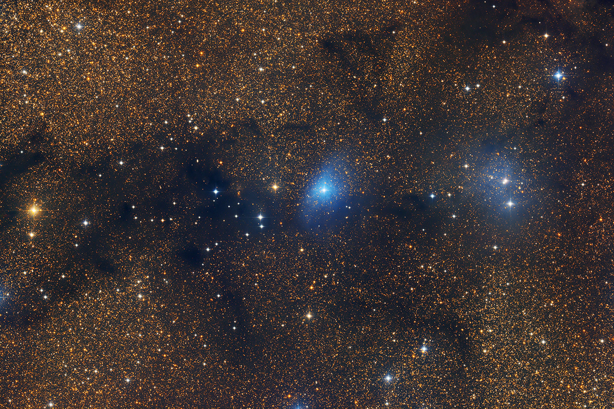 vdB126 ist ein Reflexionsnebel im Sternbild Fuchs (Vulpecula). Er befindet sich in einer langgezogenen Dunkelwolke, die auch als LDN767 bzw. LDN768 katalogisiert ist. Der blaue Nebel entsteht durch Streuung des Lichtes von HD 182918 an den Teilchen des umgebenden Mediums. Die Spektralklasse dieses Sterns ist B6V. Rechts neben vdb126 ist ein weiterer, blauer Reflexionsnebel zu sehen der als GN 19.22.6 katalogisiert ist. Sein Licht stammt vermutlich vom Stern HD 344313, einem B2V Stern. Eine Übersichtsaufnahme der Region, 14 Jahre zuvor gemacht mit einem Takahashi FSQ 106 can be found here. |