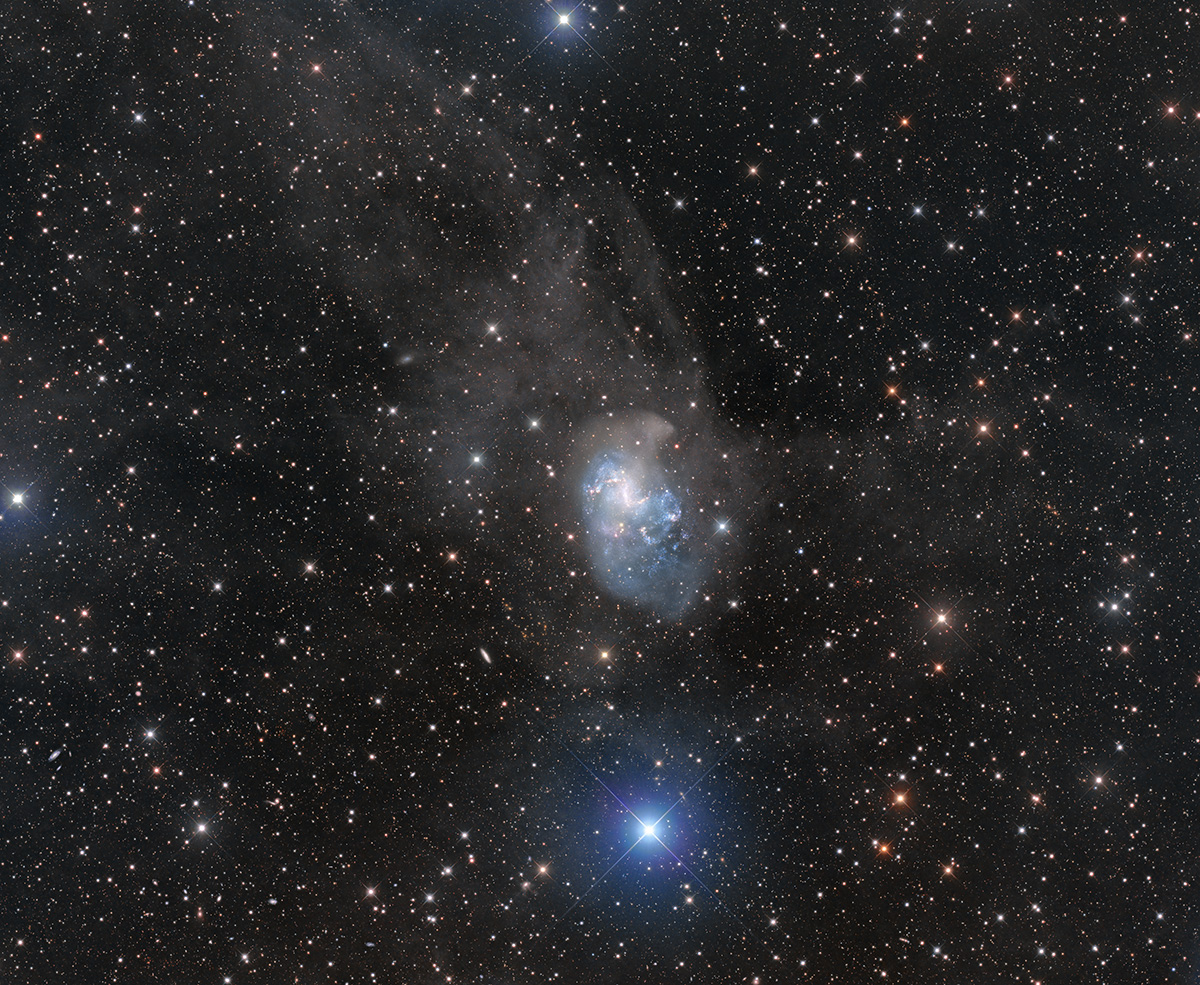 NGC 1313 is a chaotic-looking starburst galaxy with a striking central bar. Its diameter is only about one-third of that of our Milky Way. |