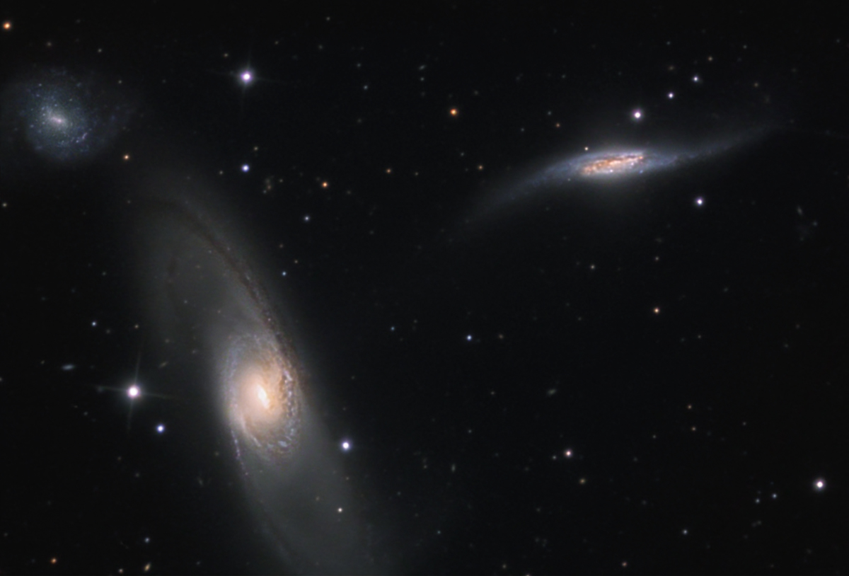 Die SBc-Galaxie oben links ist NGC 5569, die Haupt-Galaxie ist NGC 5566 und die stark verformte Galaxie rechts oben ist NGC 5560. Alle drei Galaxien gemeinsam sind auch als Herschel 400 und Arp 286 bekannt. Das Bild wurde mit Hilfe von CCDSharp und "digital development" (DDP) bearbeitet. |