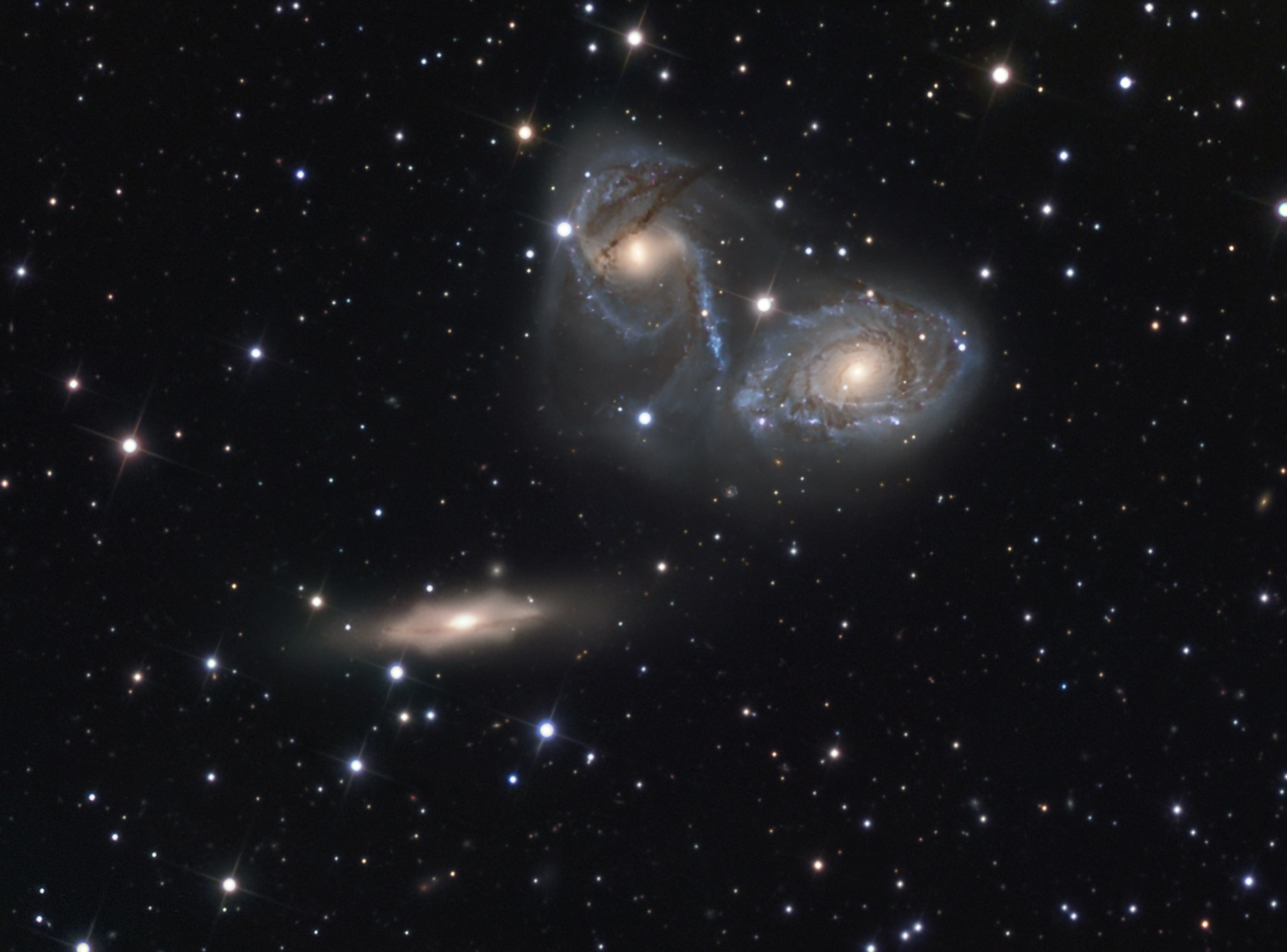 Gelegentlich kommt es vor, dass ein mehr oder weniger ungewöhnlicher Ort im Weltall von gänzlich verschiedenen Stellen der Erde fast gleichzeitig betrachtet wird... Nicht wissend, dass die ESO dieses Galaxien-Trio im April 2004 aufgenommen hatte, haben wir uns an ihm im Juni versucht. Kurz nach der Rückkehr aus Namibia haben wir dann das entsprechende ESO-Bild "entdeckt" :-(