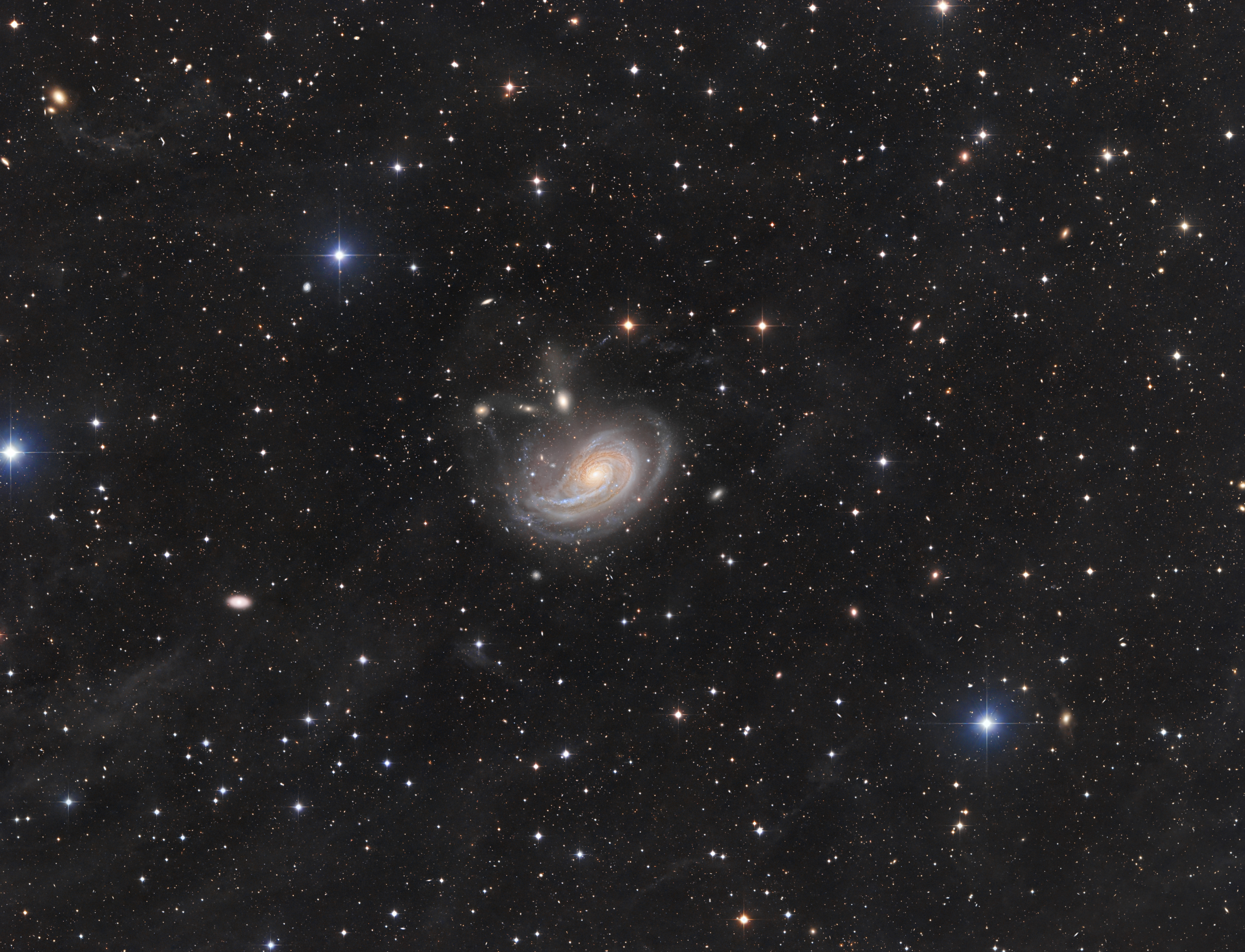 NGC 772 (Arp 78) ist eine SA(s)b-Galaxie in 115 Mill. Lichtjahren Entfernung. Mit einer Ausdehnung von 240.000 x 144.000 Lj. übertrifft sie unsere Galaxie deutlich an Größe. In dieser tiefen Aufnahme finden sich darüber hinaus bis fast zum doppelten der 240.000 Lj. schwache Galaxienausläufer, die insbesondere nördlich des Galaxienkerns mit drei kleinen Begleitgalaxien in Wechselwirkung treten. |