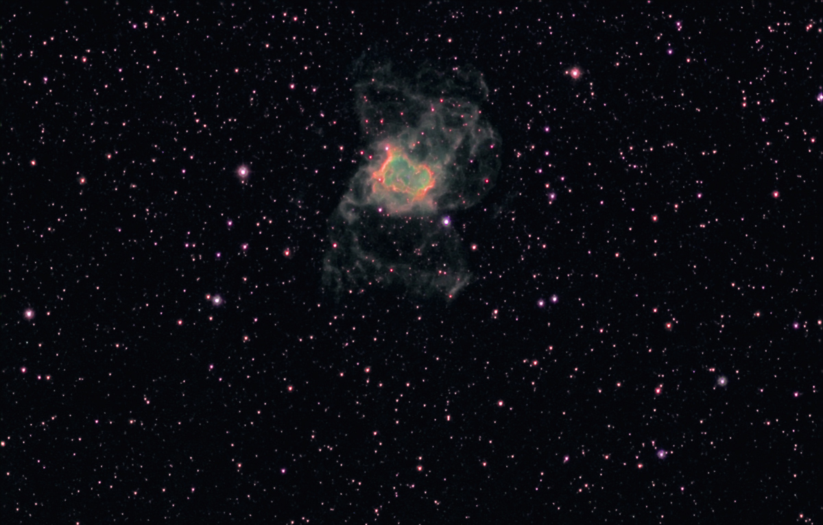 | Exposure time: | L: 8x120 sec. 1x1 bin, Ha,OIII:: 8x300 sec. 1x1 bin, B:4x120 sec. 2x2 bin |