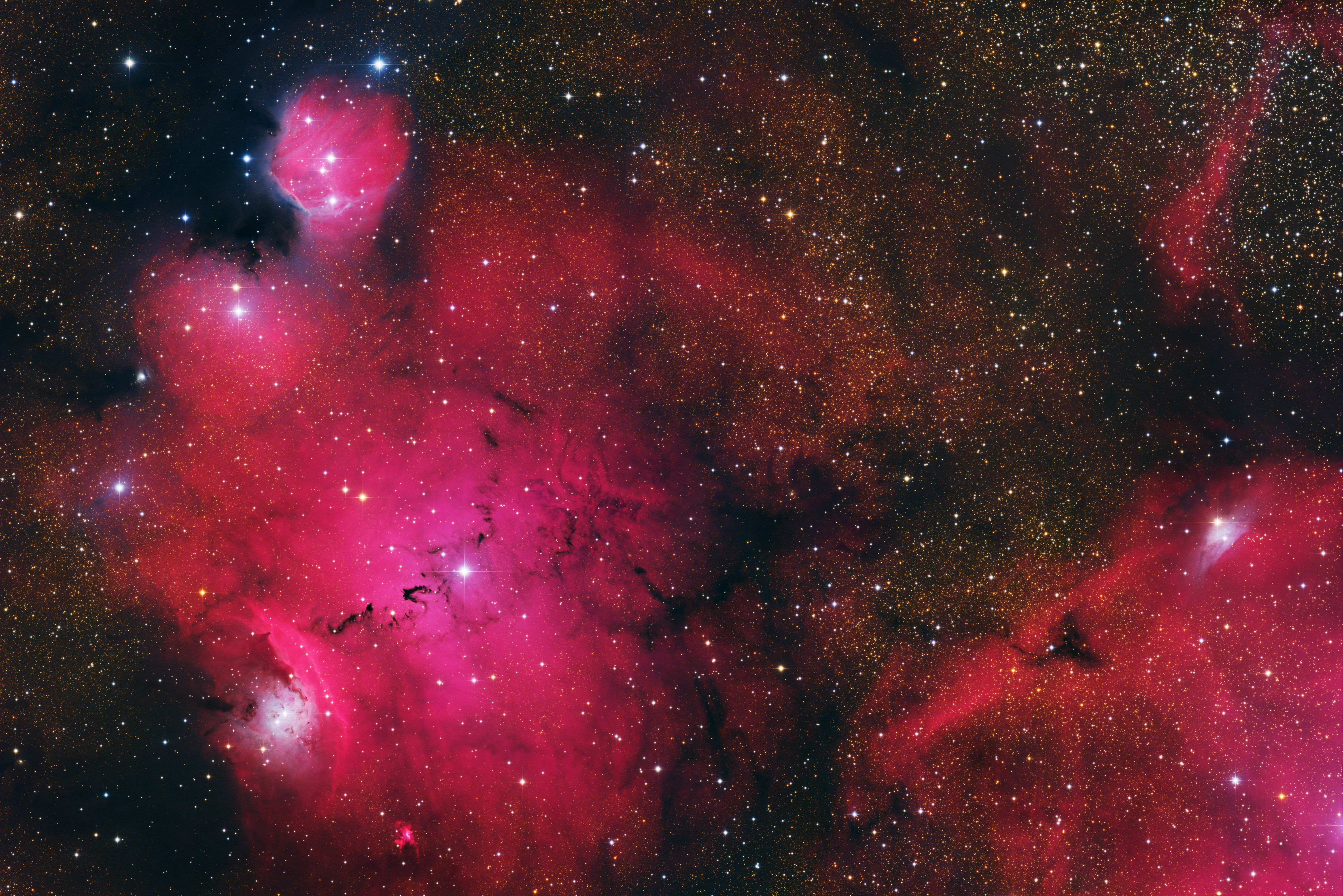 NGC 6559/IC 4685 ist ein Gasnebel im Sternbild Schütze. Häufig ist er auf Weitfeldaufnahmen als Anhängsel von Messier 8 zu sehen, doch wir wollten diesem Nebel einmal seine eigene Bühne geben. Ein Teil von Messier 8 ragt jedoch rechts noch ins Bild hinein, bemerkenswert ist dort der kleine, blau leuchtende Reflexionsnebel IC 4678. Das derzeit vielleicht bekannteste Bild der Region wurde erst vor wenigen Tagen vom Vera C. Rubin Observatory veröffentlicht.Links unten im Bild steht zentral in einer großen H-II-Region der Stern HD 165921, ein B1V-Stern, dessen UV-Strahlung die Quelle für die Ionisation des Wasserstoffgases ist. Von diesem Stern ausgehend schlängelt sich eine kleine dunkle Wolke durch den Nebel, die an einen chinesischen Drachen erinnert. Katalogisiert ist dieser Dunkelnebel als Barnard 303. Dieser kleine Dunkelnebel weist auf einen Reflexionsnebel, NGC 6559, der sich direkt dahinter befindet. Vorgelagert erkennt man eine schöne Formation, die Astronomen als „Bright Rims“ bezeichnen.Oben links im Bild ist ein weiterer kleiner Nebel, LDN 227, zu sehen. Dieser scheint regelrecht eine Höhle in den Dunkelnebel Barnard 91 geblasen zu haben. Eingefasst wird dieses kleine Juwel von blau leuchtenden Reflexionsnebeln. |