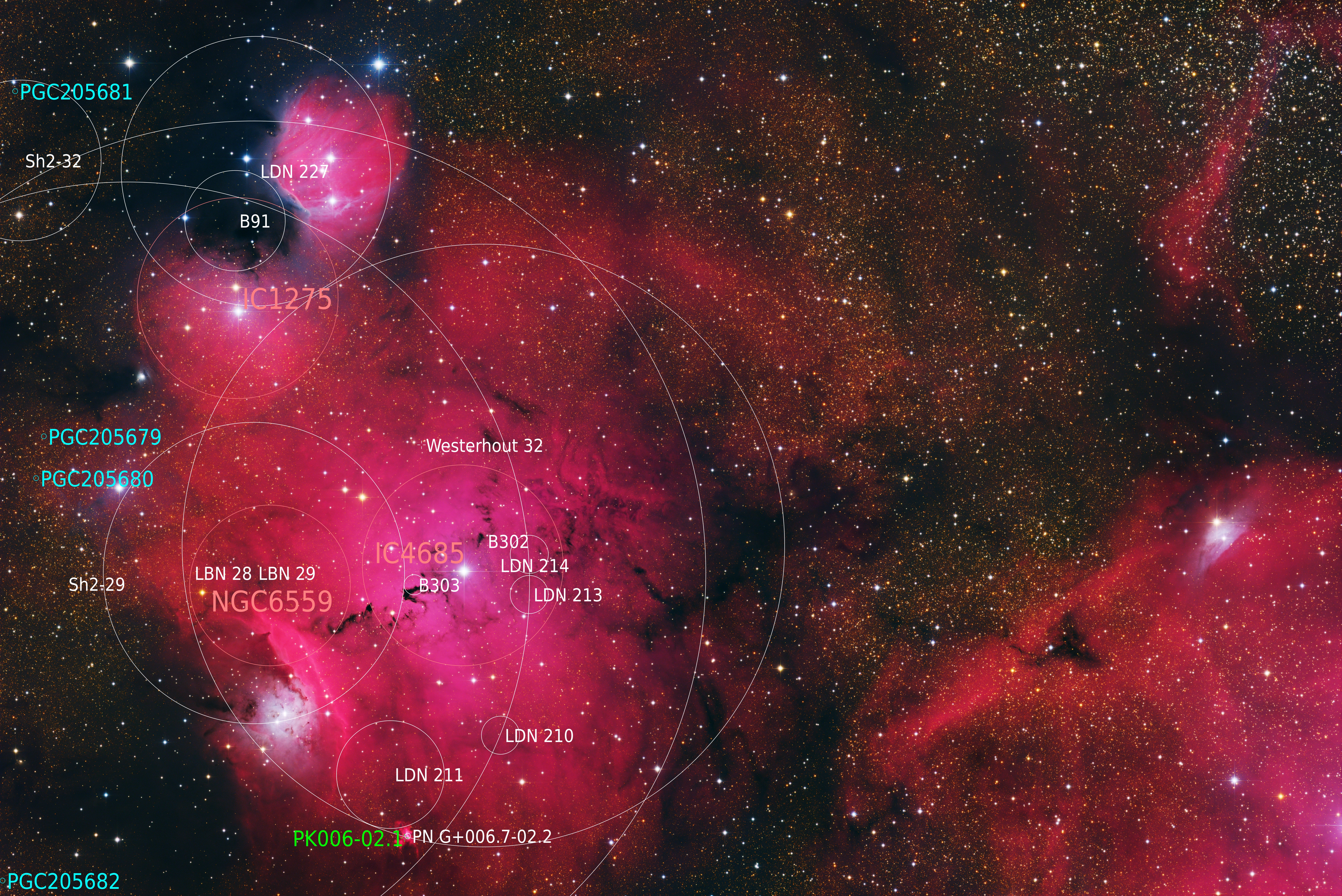 NGC 6559/IC 4685 is an emission nebula located in the constellation Sagittarius. It often appears as an appendage of Messier 8 in wide-field images, but we wanted to give this nebula its own stage for once. However, part of Messier 8 still extends into the right side of the frame, where the small, blue-glowing reflection nebula IC 4678 is particularly remarkable. The currently perhaps most well-known image of this region was released just a few days ago by the Vera C. Rubin Observatory.In the lower left of the image, centrally located within a large H II region, stands the star HD 165921, a B1V-type star whose UV radiation is the source of the ionization of the surrounding hydrogen gas. Starting from this star, a small dark cloud winds its way through the nebula, resembling a Chinese dragon. This dark nebula is cataloged as Barnard 303. This small dark nebula points toward a reflection nebula, NGC 6559, which lies directly behind it. In front of it, you can see a beautiful structure that astronomers refer to as "Bright Rims."In the upper left of the image, another small nebula, LDN 227, is visible. It appears to have carved out a cave-like opening in the dark nebula Barnard 91. This small jewel is framed by blue-glowing reflection nebulae. |