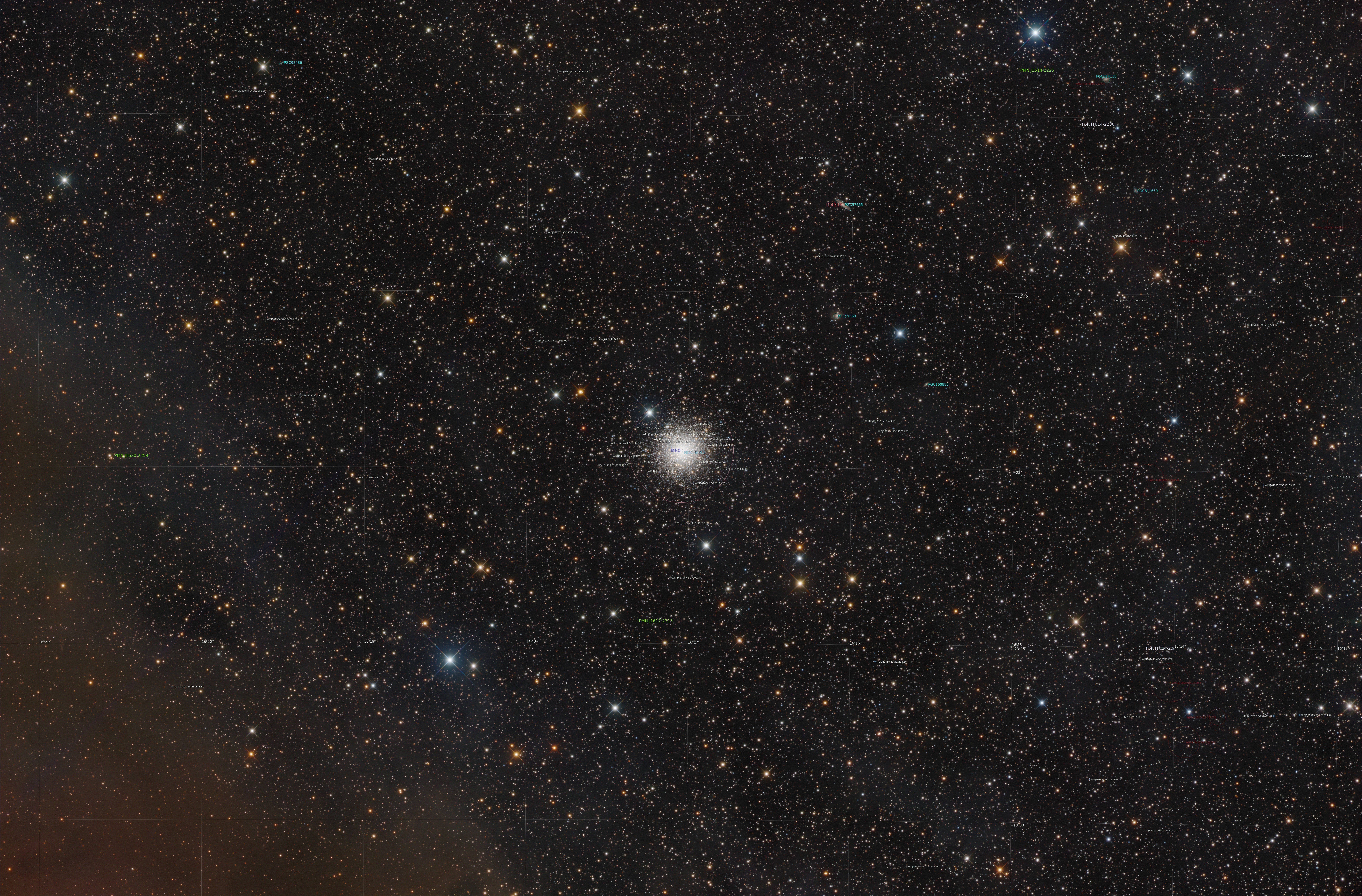 Remarks: | Messier 80, located in the constellation Ophiuchus, is one of the most densely packed globular clusters known. Despite its remarkable age of approximately 13.5 billion years, it contains a significant population of blue stars known as blue stragglers. These stars are thought to form through collisions and mergers of older, lower-mass stars. Such stellar collisions are extremely rare in the universe—even during galactic mergers—but they become possible in environments with exceptionally high stellar densities. In the case of M80, the central density reaches 5.7 solar masses per cubic parsec, whereas in the solar neighborhood, the stellar density is only about 0.05 solar masses per cubic parsec. |